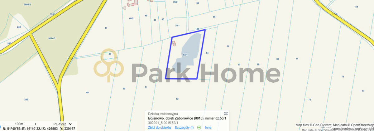 Działka znajduje się w miejscowości Zaborowice, gmina Bojanowo - idealna alternatywa dla wymagającego klienta kochającego naturę i spokój, jednocześnie oczekującego bliskości strefy miejskiej (8 minut samochodem do Bojanowa, 20 minut samochodem do Leszna, 20 minut samochodem do Rawicza).